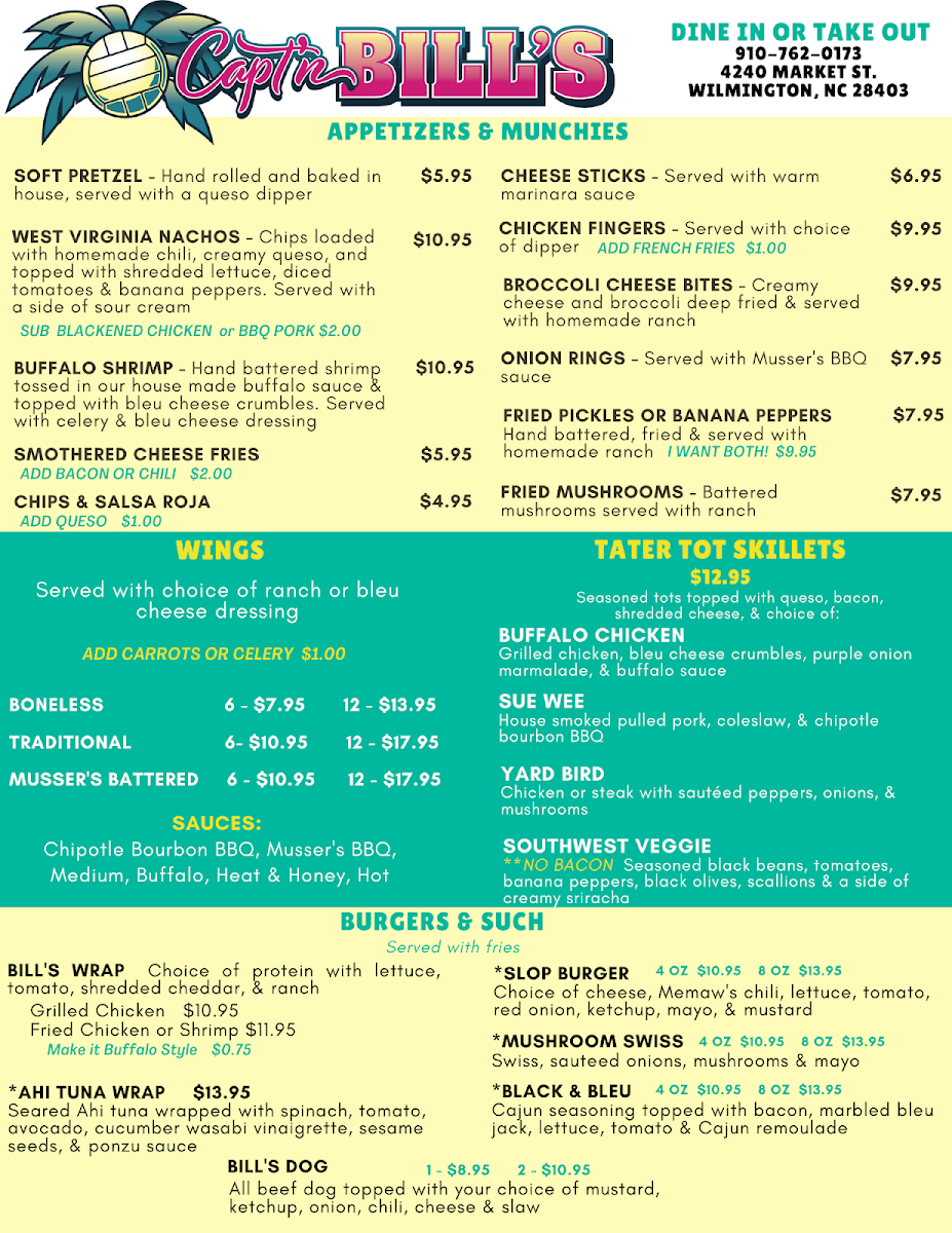 Welcome to Capt'n Bill's Backyard Grill & Volleyball Facility, a vibrant gem nestled in Wilmington, NC. Here, the menu is a delightful blend of flavors crafted to enhance your laid-back experience whether you're here to cheer on friends or simply unwind.